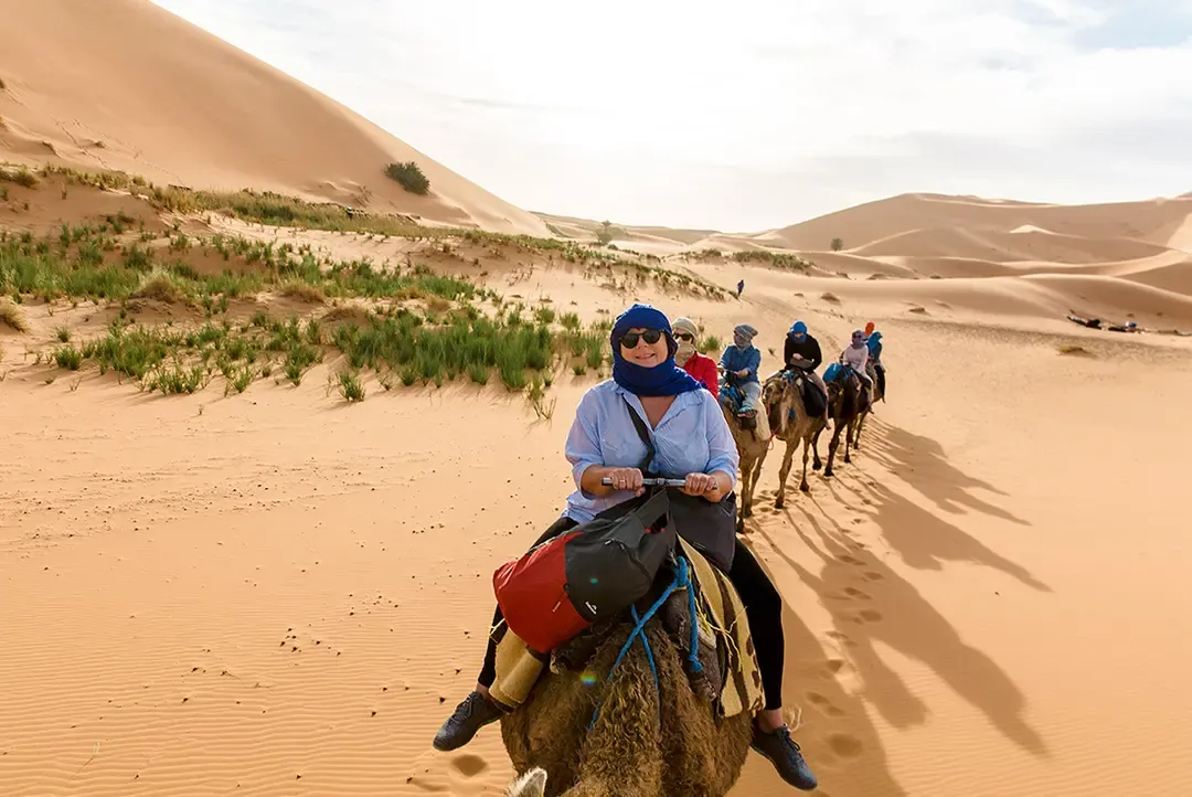 La journée se poursuit en direction du désert de Merzouga avec une expérience unique incluant une excursion en 4x4, une balade à dos de chameau, l’ascension des dunes et un magnifique coucher de soleil. Retour à l’hôtel en fin de journée pour un dîner buffet, une soirée animée et nuit à l’hôtel.